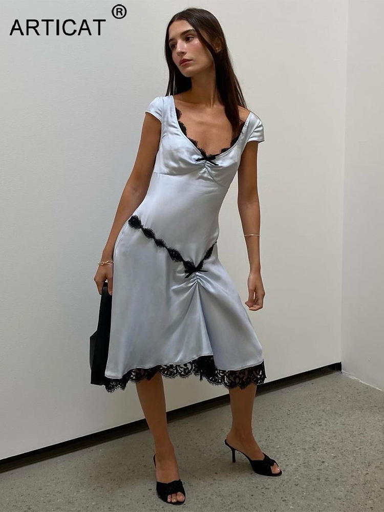 Articat Satin Lace V-Neck Shirring Asymmetrical Slim Midi Dress Women Sexy Solid Dress 2023 Spring Summer New Sweet Partywear