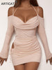 Articat Sexy Halter Shirring Cut Out Long Sleeve Mini Slip Dress Women Lace Up Mesh Swing Collar Hollow Out Wrap Dress Partywear
