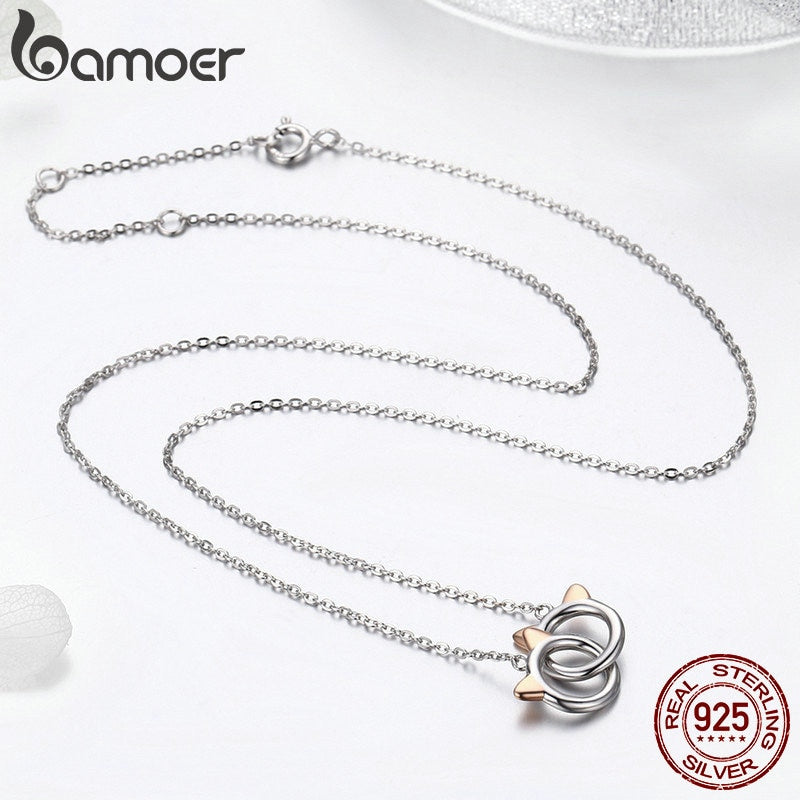 Bamoer New Arrival 925 Sterling Silver Double Circles Pet Cat Pendant Necklace Cute Animal Chain for Women Jewelry Gift SCN252