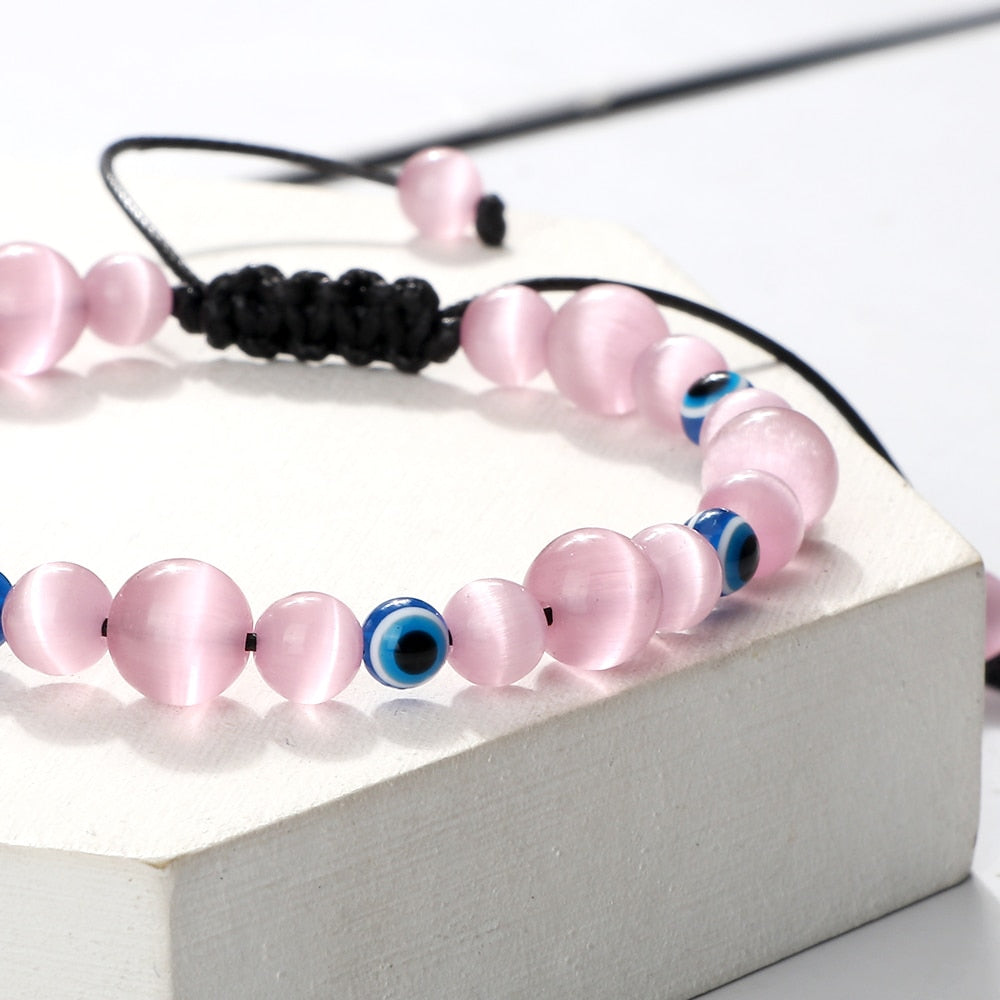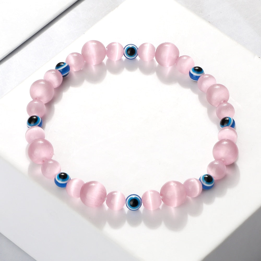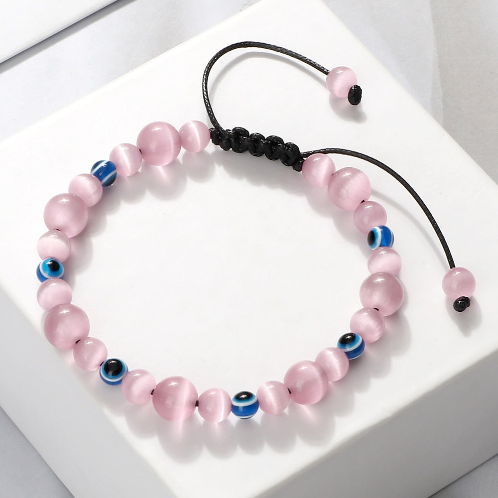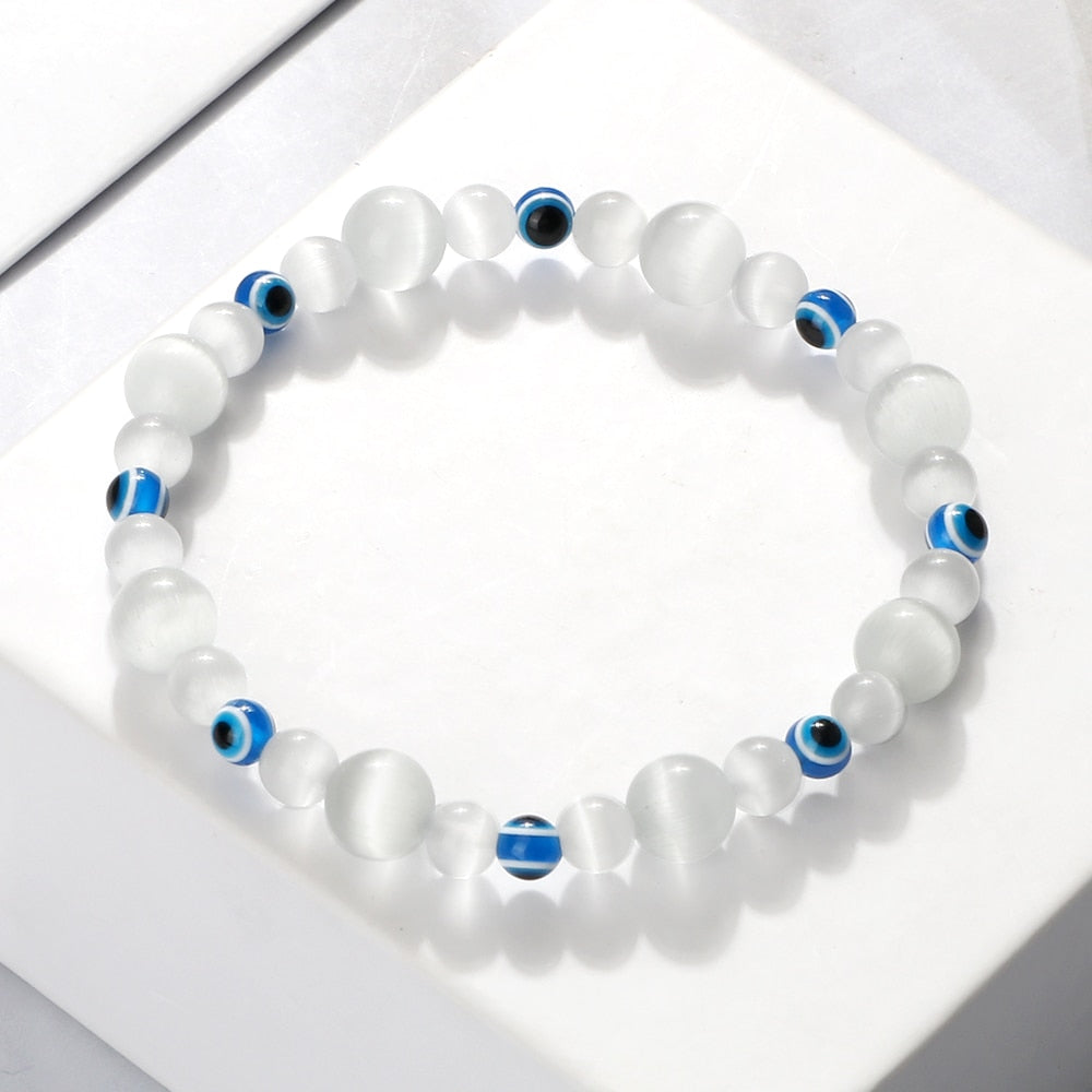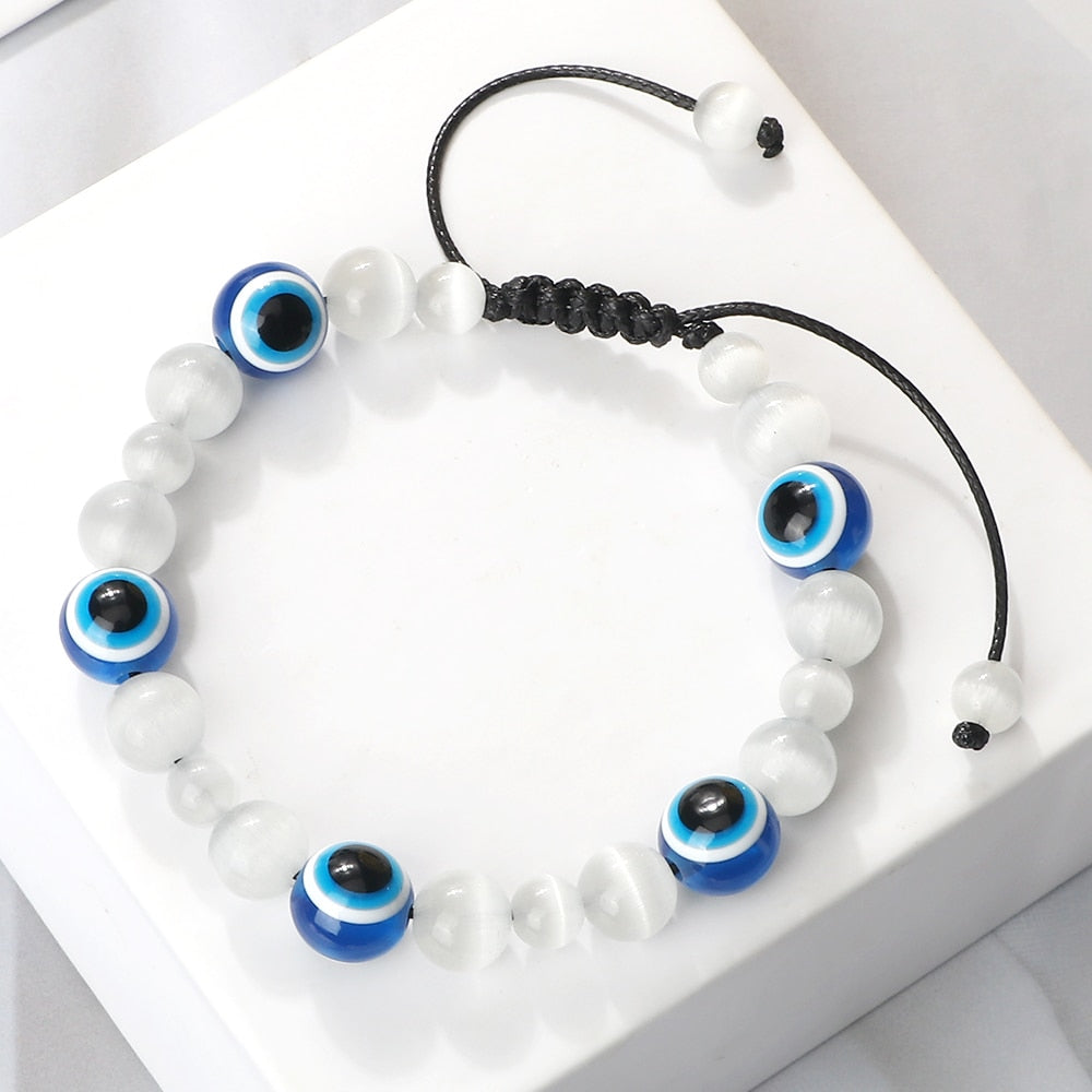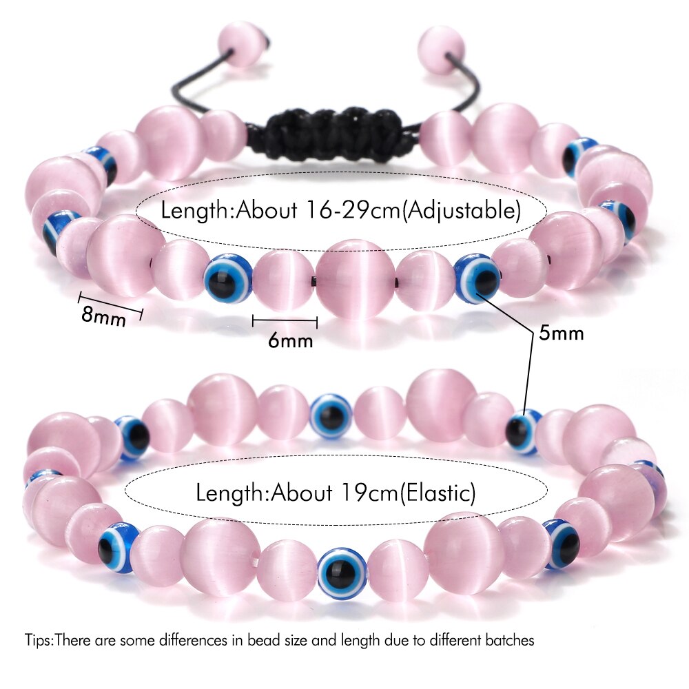 This Blue Evil Eye Beaded Bracelet is made from natural cat eye stones with a diameter of 6 to 8mm and opal accents. It is an adjustable bangle that can be worn by both men and women, making it a perfect gift for anyone who loves lucky and yoga jewelry. The blue evil eye symbol is said to bring protection and good luck to the wearer, making this bracelet an ideal accessory for those who believe in its power. The adjustable design makes it easy to wear and comfortable for all wrist sizes, making it a versatile piece of jewelry. Whether you're looking to add a pop of color to your outfit or simply seeking protection, this bracelet is the perfect choice.