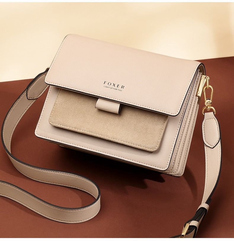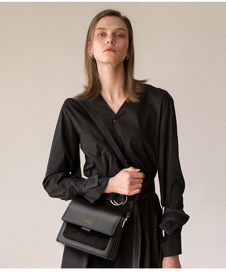 This bag has a modern and trendy design, with a split leather exterior and a flap closure that adds a stylish touch. It's available in a variety of colors, so you can choose the one that best suits your personal style.