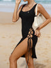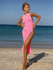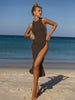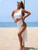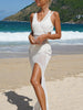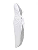 Add a touch of sophistication to your beach or poolside look with this stunning white cover-up dress. Featuring a one-shoulder design and sleeveless silhouette, this long dress is perfect for keeping you cool and comfortable on hot summer days. The solid white color makes it easy to pair with any swimsuit, while the flowing fabric provides a breezy, effortless style. Whether you're lounging on the sand or strolling along the boardwalk, this chic cover-up dress is a must-have for any fashion-forward beachgoer.