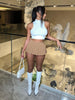 The skirt is made from a stretchy fabric that is comfortable to wear and conforms to your body shape, providing a flattering fit. The mini length adds a youthful and playful vibe, making it perfect for pairing with crop tops or tucked-in blouses.
