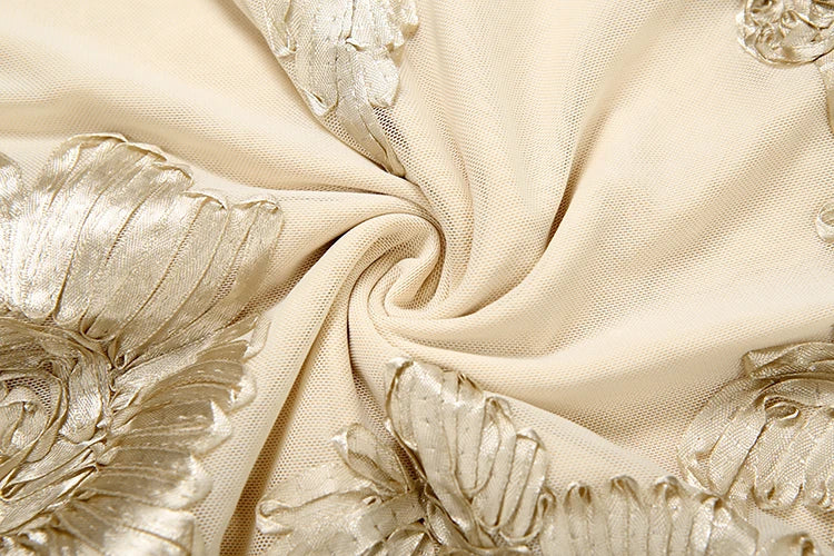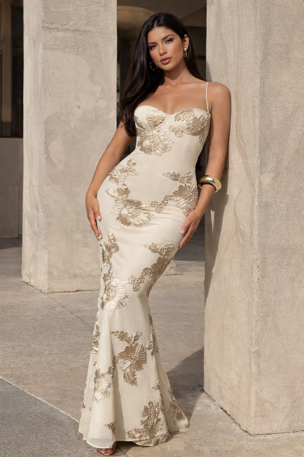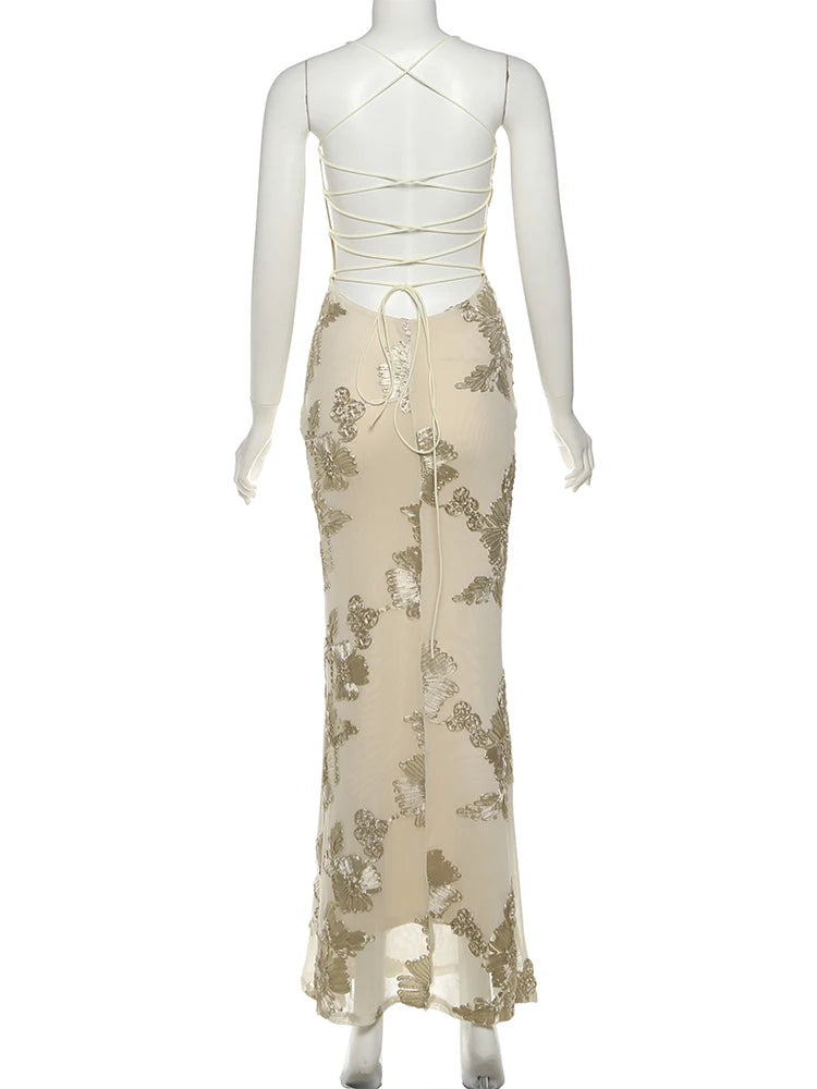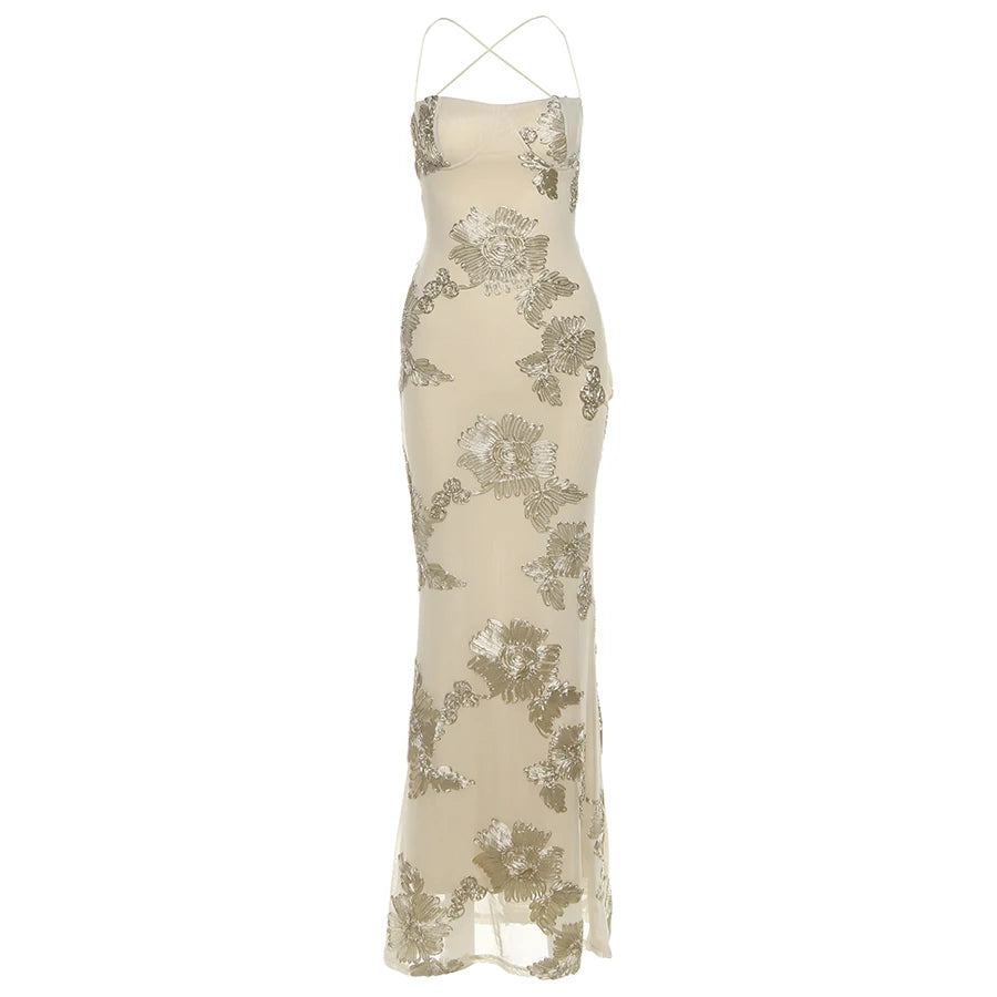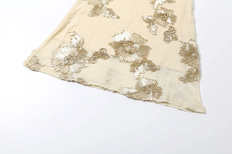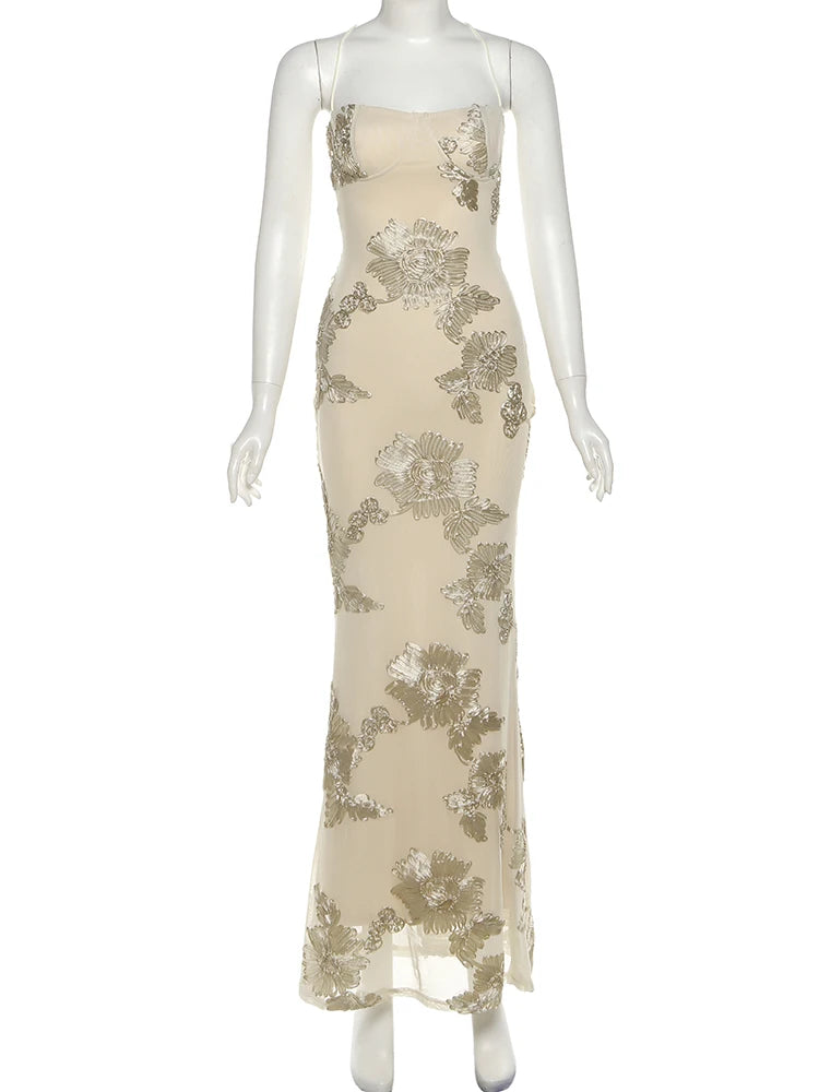 Intricate floral embroidery adds a romantic texture across the soft neutral fabric, while the sleek maxi-length design flows gracefully into a subtle mermaid-style hem for an elevated, sophisticated look.