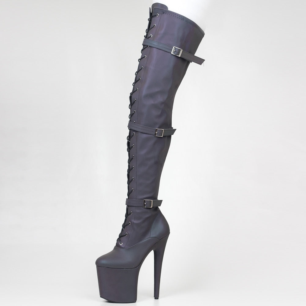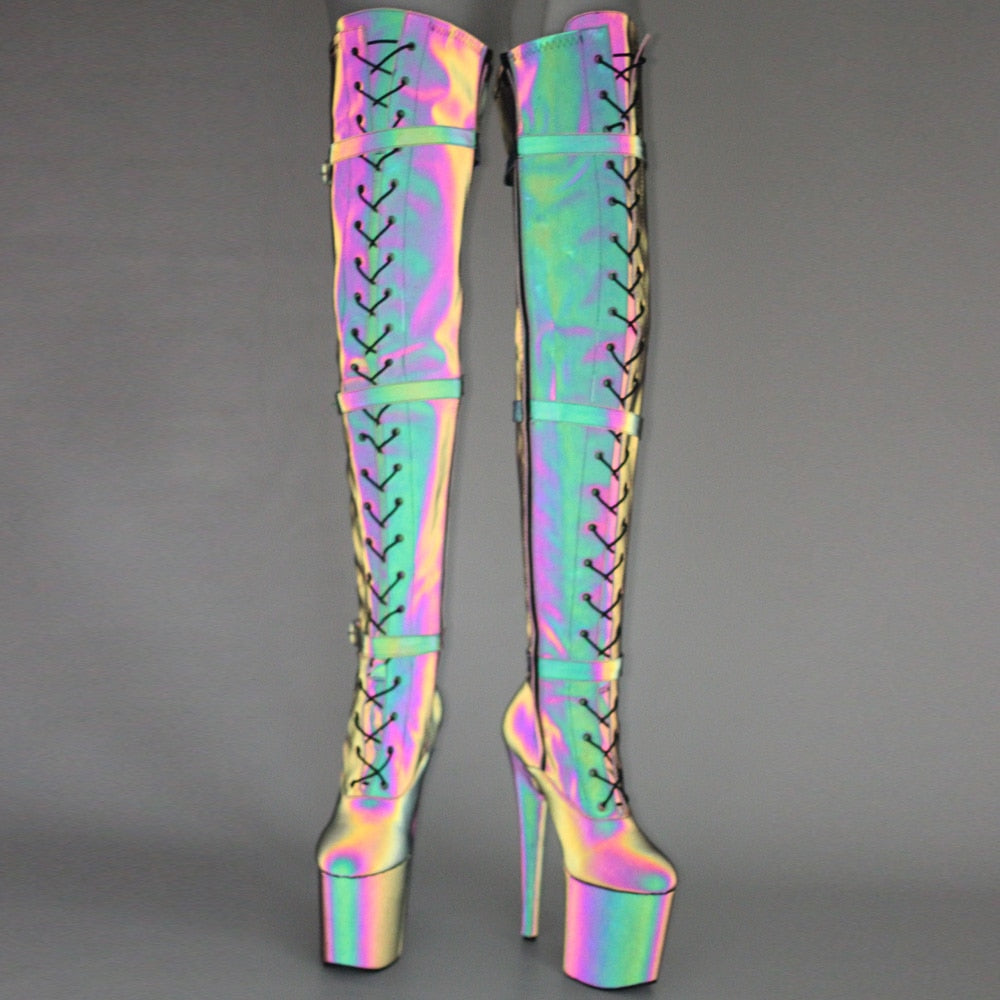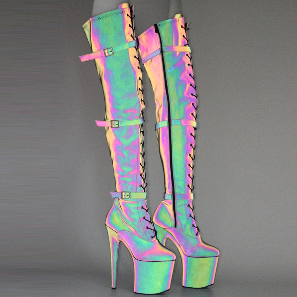 Lace-up thigh-high boots are a type of footwear designed for pole dancing, featuring a colorful reflective fabric with a luminous effect. These boots have a high platform sole, providing height, stability, and support during pole dancing performances. The platform sole extends under the ball of the foot and heel, providing additional comfort and stability.