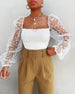 The Mesh Sheer Blouse Chiffon See-through Long Sleeve Top Shirt Blouse is a stylish and trendy clothing item that is perfect for adding a touch of sophistication and elegance to any outfit. This blouse features a sheer mesh fabric with a chiffon overlay, creating a see-through effect that adds interest and texture to the overall design.