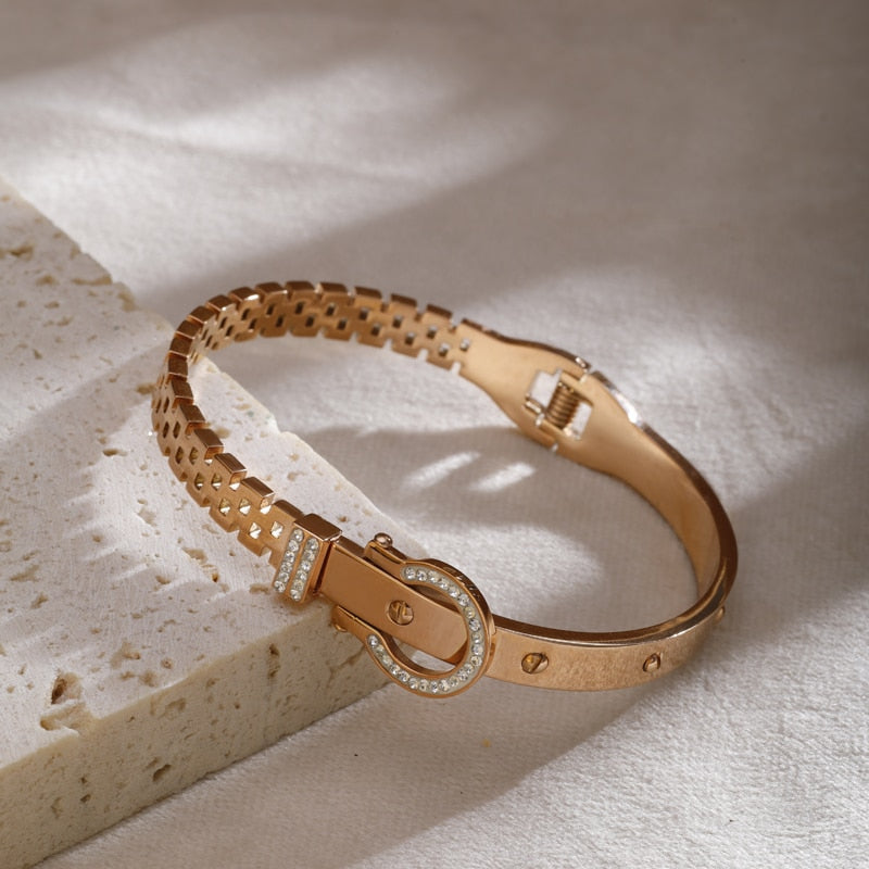 Luxury Women's Stainless Steel Crystal Bracelet is the perfect accessory for any occasion. This elegant design features a beautiful crystal-studded cuff bangle, made with high-quality stainless steel. The belt design adds a unique touch and makes it stand out from the rest. Ideal for weddings, parties or everyday wear, this bangle will add a touch of sophistication to your outfit. It makes a perfect gift for that special someone, or a treat for yourself. Upgrade your jewelry collection with this stunning PAXA bracelet!