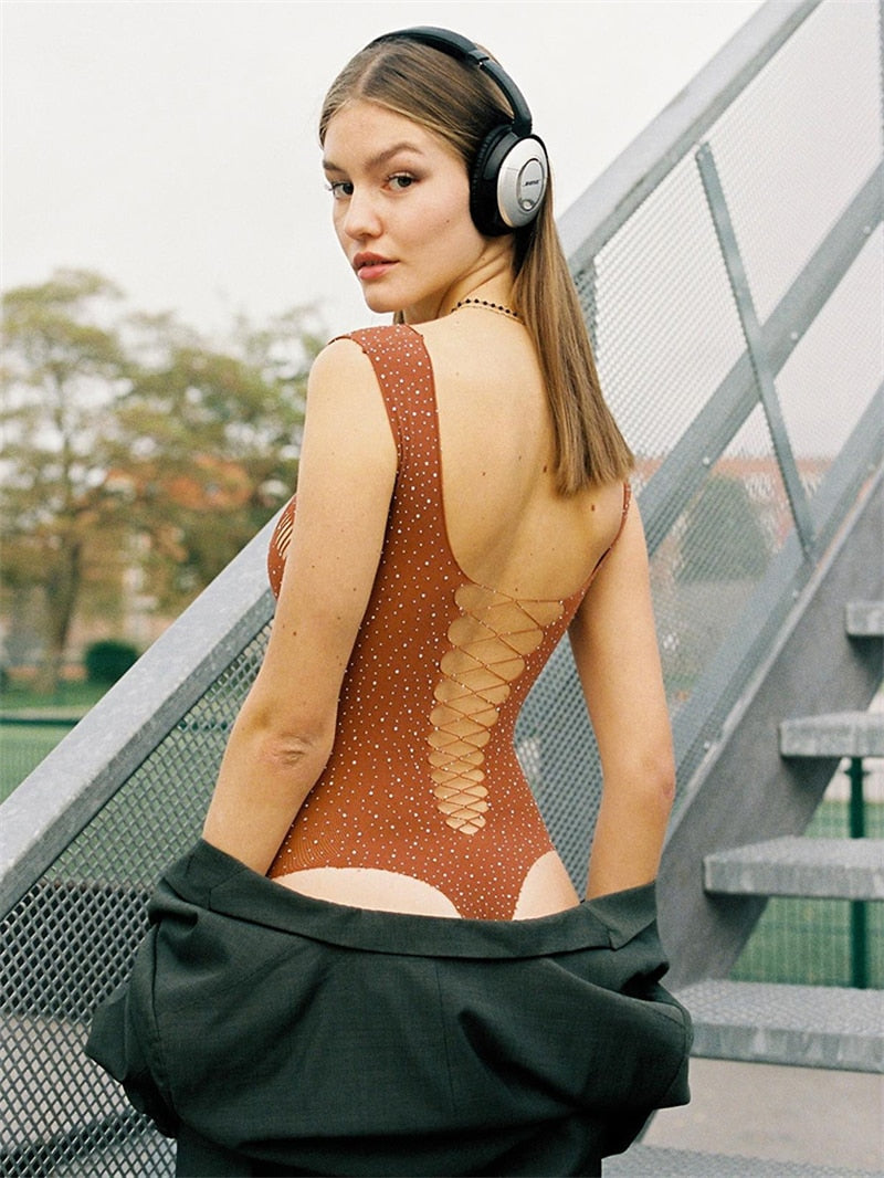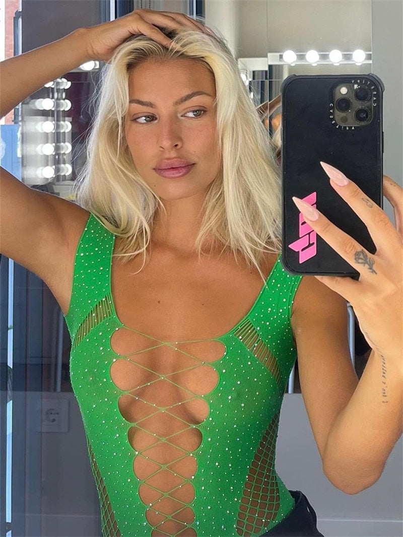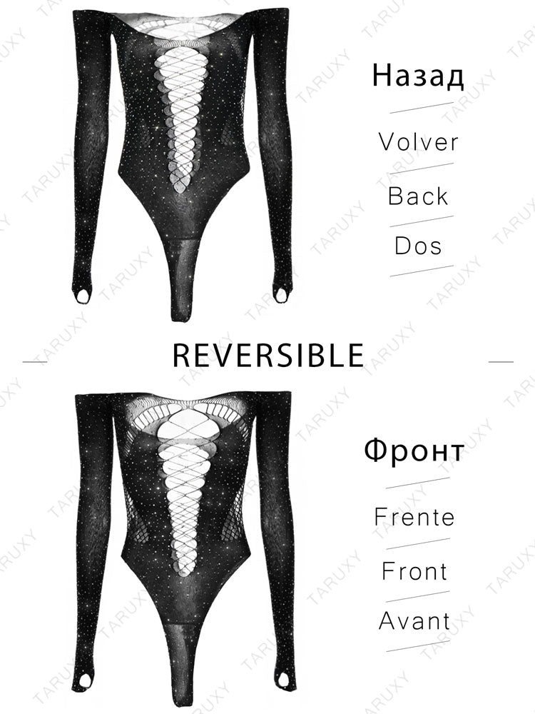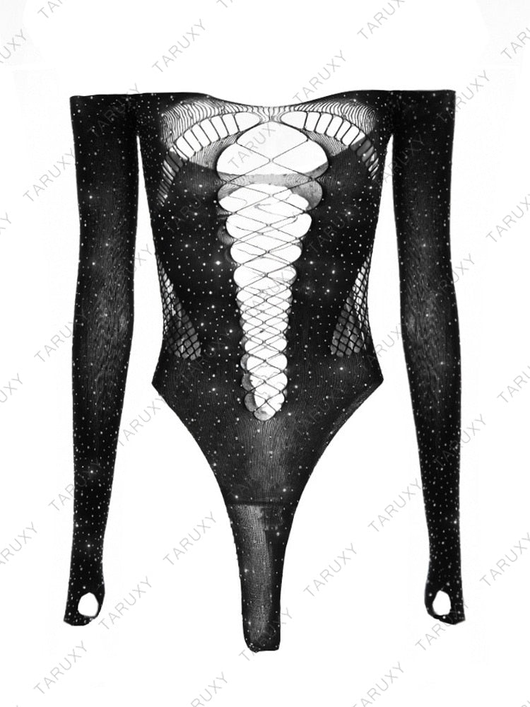 Get ready to turn heads with the Shimmering Sarah bodysuit, designed to make you feel sexy and confident on your next night out. The see-through mesh fabric is adorned with rhinestones and hot drills, adding just the right amount of sparkle to your outfit. The long sleeves provide a bit of coverage while the high-stretch elasticity ensures a comfortable fit all night long. Perfect for parties, nightclubs, or even a special date night, this bodysuit is made from high-quality polyester and acetate for durability and easy care. Get ready to dazzle in the Shimmering Sarah bodysuit.