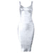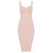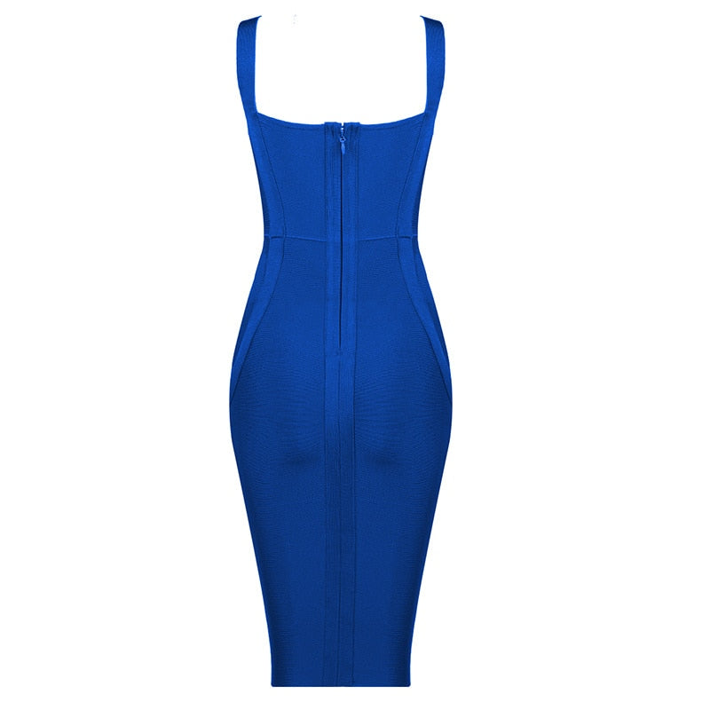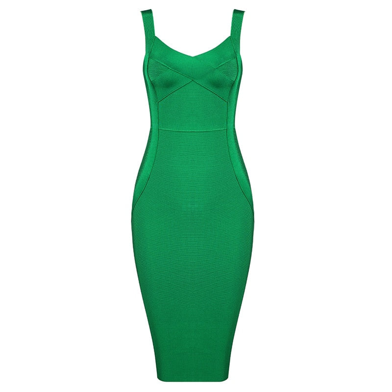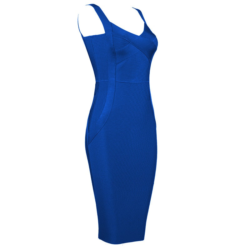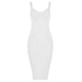 A sleeveless rayon bandage bodycon dress is a type of women's dress that features a form-fitting silhouette and is constructed from stretchy rayon material that is designed to hug the wearer's curves. The dress typically has a sleeveless design, highlighting the arms and shoulders, and is constructed using a bandage style technique that creates a series of horizontal panels. These panels are designed to fit closely to the body, creating a sculpted, figure-flattering look. The dress may be considered a fashionable choice for a range of occasions, from cocktail parties to nights out on the town.