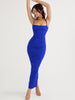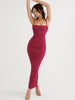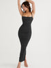 A spaghetti strap sleeveless backless zipper long dress is a type of women's dress that features thin spaghetti straps and a sleeveless design, with a backless cut that exposes the wearer's back. It typically has a long length and a fitted silhouette, and is secured with a zipper closure.