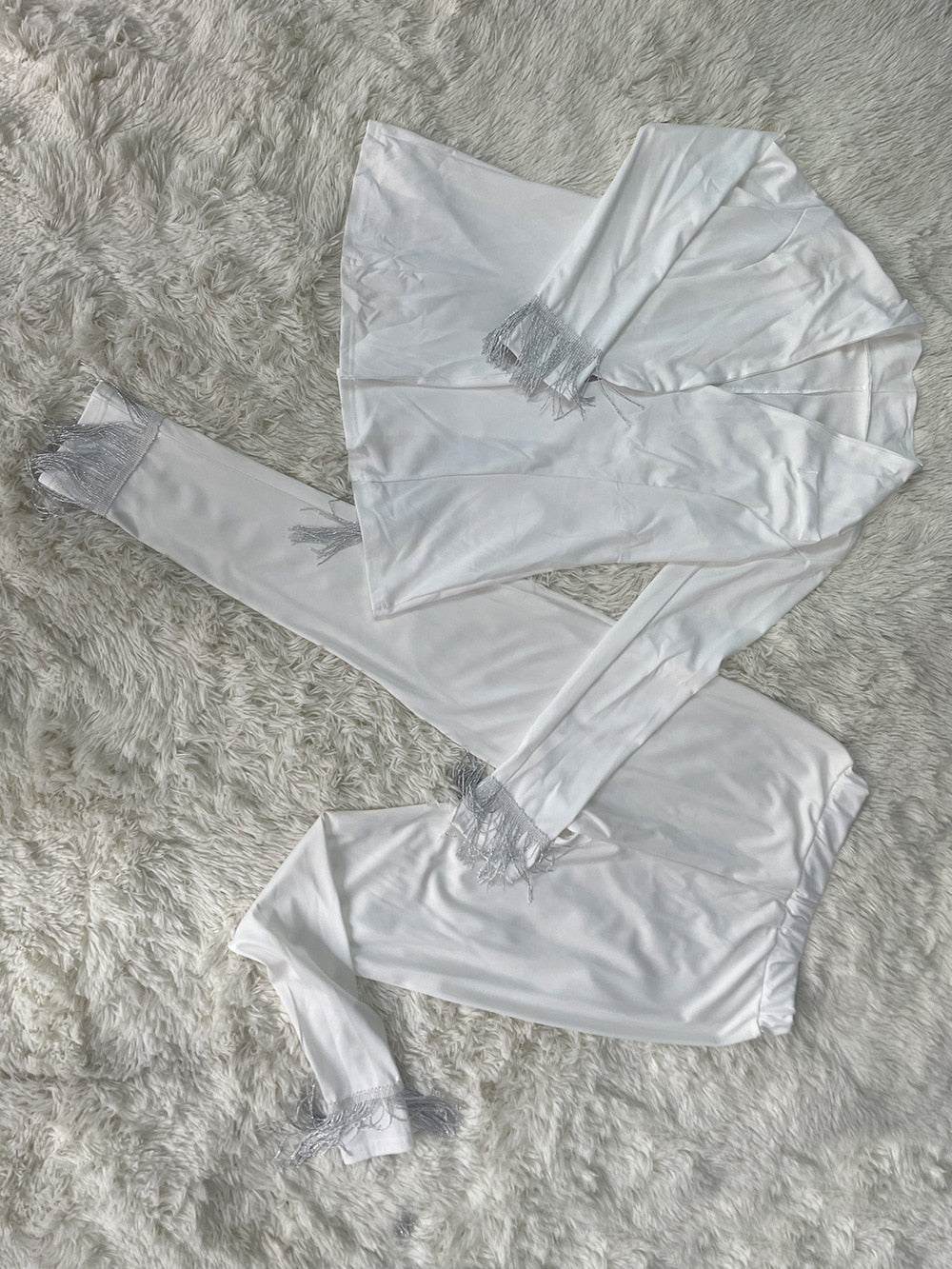 The "Tracksuit Two Piece Set Jacket Coat + Long Pants Tassel Outfit" is a trendy and stylish outfit for women that features a two-piece set consisting of a jacket coat and long pants. The set is designed to be comfortable and functional while still maintaining a fashionable and trendy look.