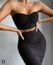 The strapless top features a tight-fitting and supportive design that accentuates the curves of the body. The material is stretchy and flexible, ensuring a comfortable and secure fit throughout the day. The knee-length skirt is designed in a pencil style, hugging the curves of the body and accentuating the hips and thighs.