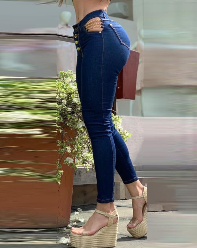 Women's Pants Chain Decor Cutout Button Fly Skinny Jeans Sexy High Waist Hip Lift Trousers Fashion Chic Daily Streetwear